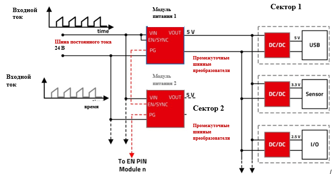 При одновременном переключении обоих модулей питания происходит положительное наложение входных токов. Для этого модули работают в так называемом режиме синхронизации.